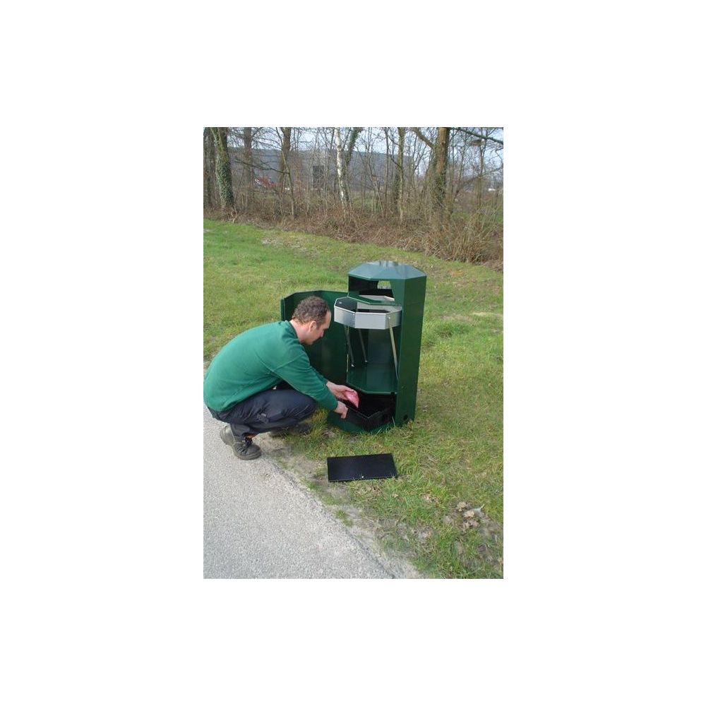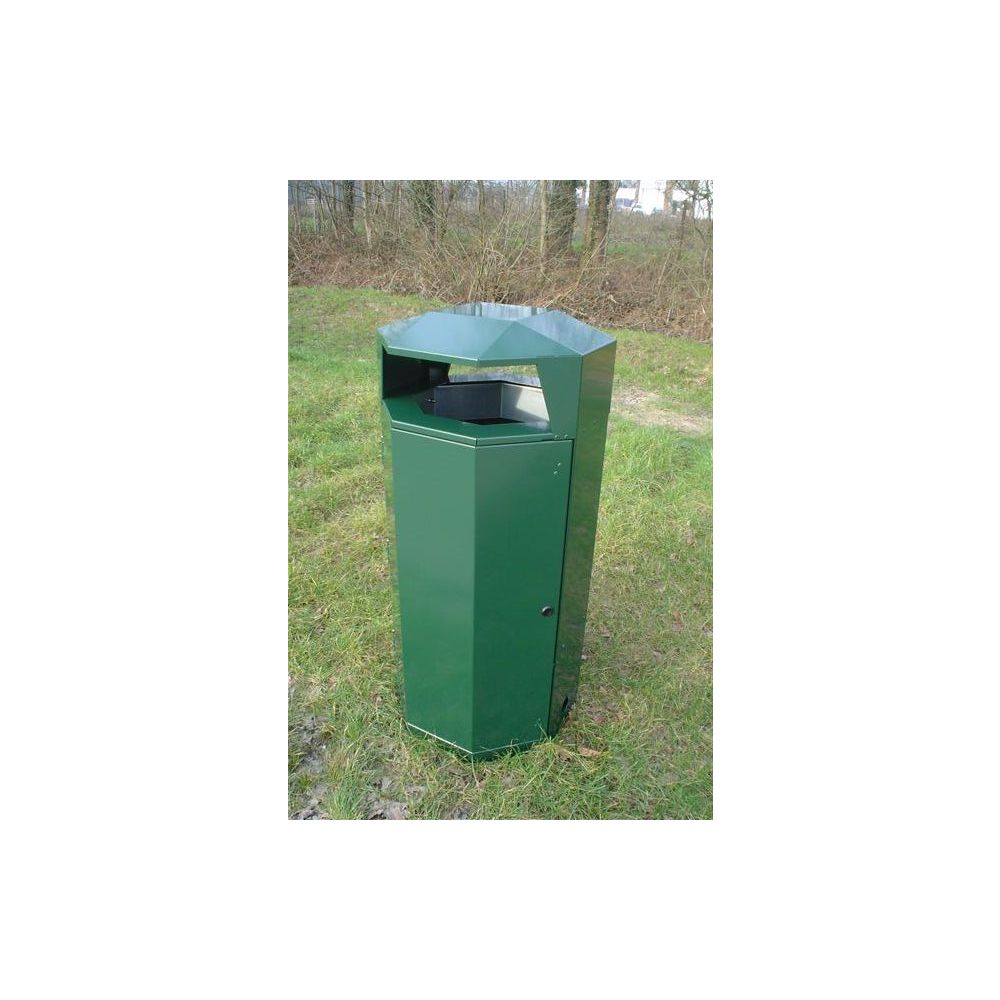 Een optimale combinatie van afvalverwerking en knaagdierbestrijding. Afvalbak (afm. 505x505x1106 mm. uitwendig) uit verzinkt staal voorzien van dubbele poedercoating, inhoud 95 liter. Kleur is groen (RAL 6009). Afsluitbare deur voorzien van driekantslot met spanjolet-sluiting. Uitgerust met gegalvaniseerde binnenbak, een betonvoet en de Duofield Collector (uittrekbaar).