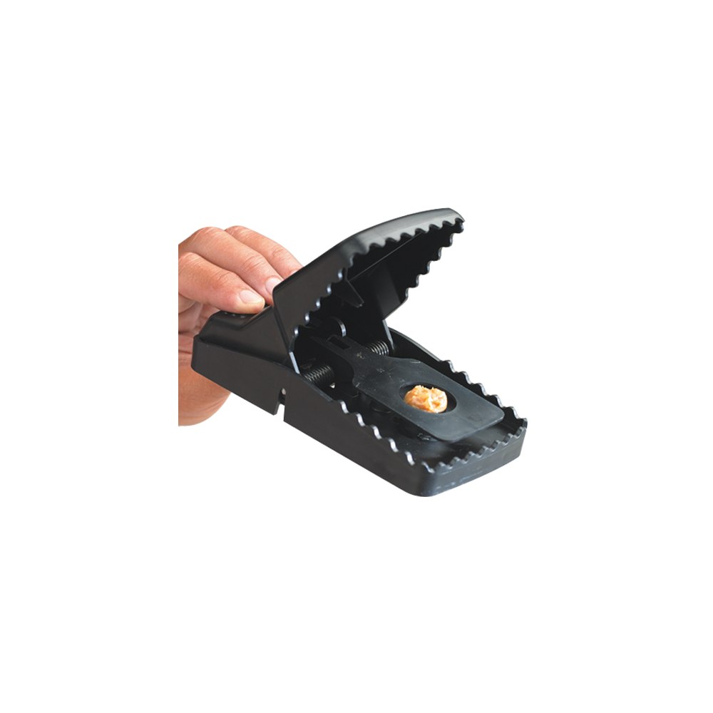 Piège mécanique pour la capture des rats. Le piège est muni d’un récipient à appât amovible pour faciliter la maintenance. Le piège s’arme à la main ou avec le pied. Doté de mâchoires brevetées pour un maximum de force et d’efficacité.